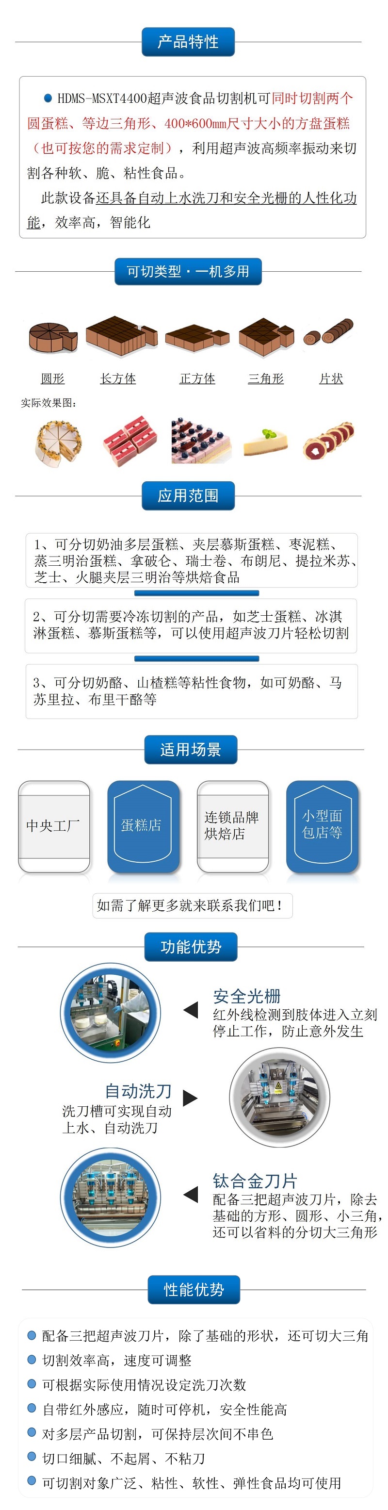 該設(shè)備配備雙把超聲波刀片,既可切方蛋糕,也可同時(shí)切兩個(gè)圓蛋糕,效率更高
