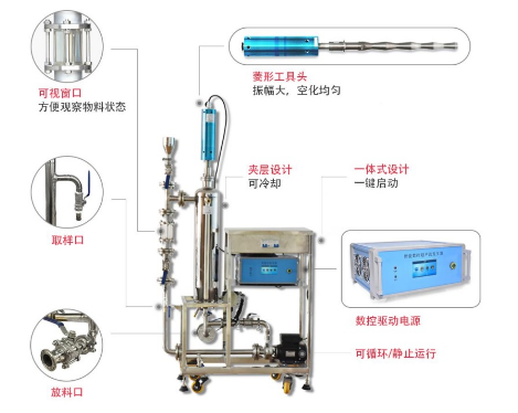 The ultrasonic dispersion pilot circulating testing machine can also be called industrial ultrasonic disperser. It consists of ultrasonic host, numerical control driving power supply, circulating reactor and peristaltic pump. In addition, temperature detection, pressure detection and solid-liquid mixing feeder are optional. Usually, it is used to simulate the process of pipeline ultrasonic processing. This series combines all the handling, R&D and testing projects of ultrasonic liquid. The ultrasonic power ranges from 1000W to 3000W and the volume is more than 5L.